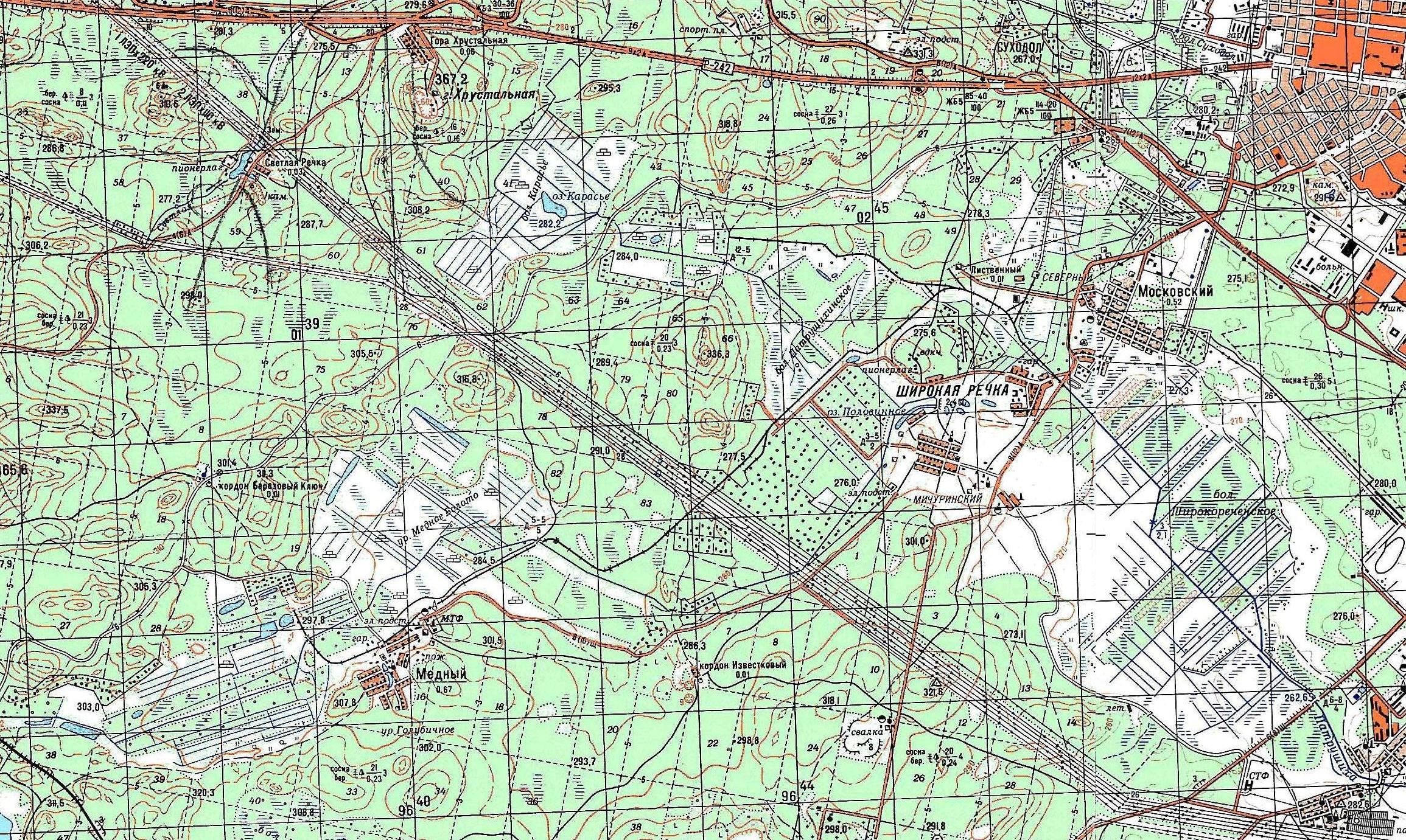 Узкоколейная железная дорога на топографической карте масштаба 1:100 000, изданной в 1986 году.