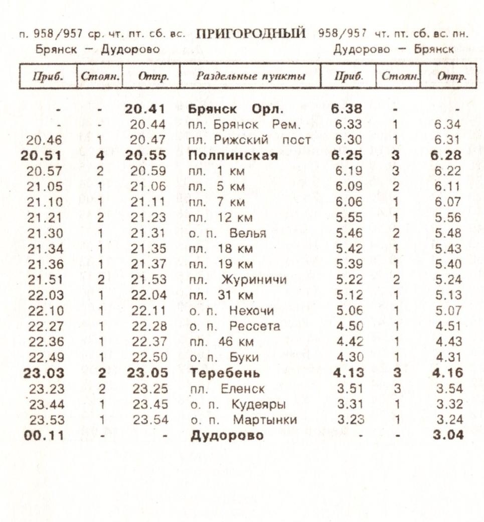 С 3 июля 2006 г. пп 958 Брянск-Дудорово отпр. 20:41 будет следовать до станции Еленск по чт, пт, воскр. Поезд 957 Еленск-Брянск отпр. 3:54 по пт, субб, пон.