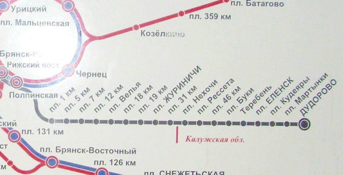 Железнодорожная линия на схеме пригородного сообщения Брянского узла, вывешенной в электропоезде