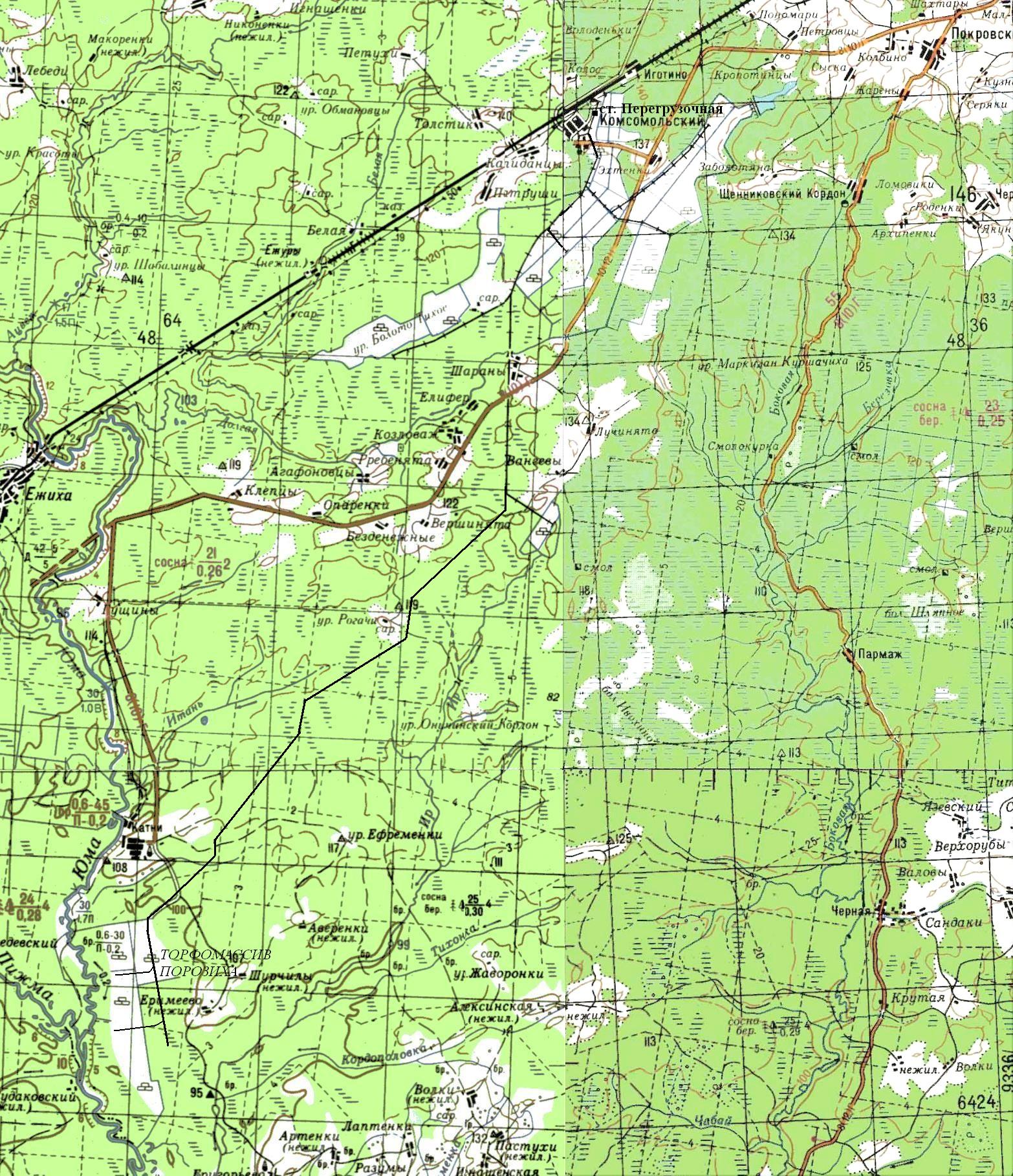 Узкоколейная железная дорога на топографической карте масштаба 1:100 000, изданной в 1988 году (новый участок не показан).