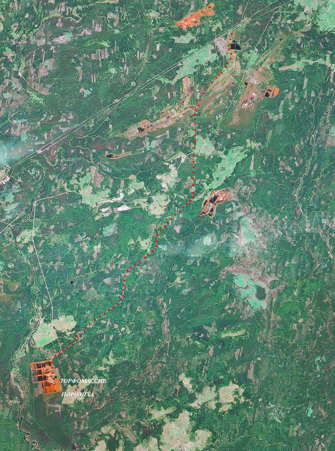Узкоколейная железная дорога на спутниковом снимке (источник — «Google Maps», ориентировочная дата съёмки — 2004 год).