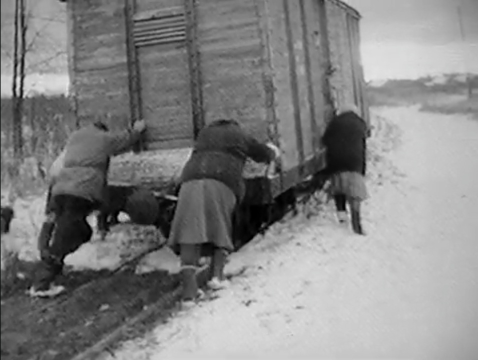 Где то 30 минут его толкают до стрелки до путей, где ещё хоть как то проезжал мотовоз.
