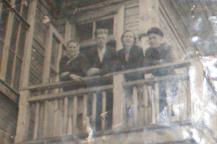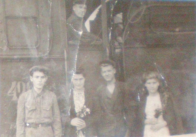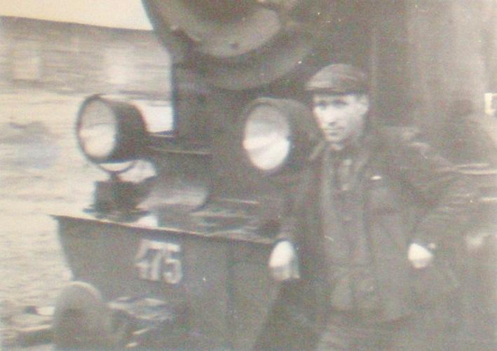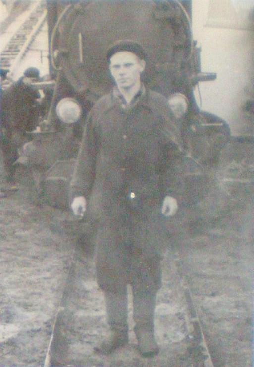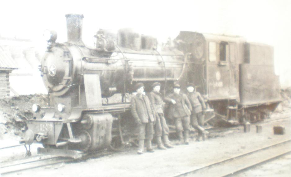 Апрель 1951 года. Железнодорожники у паровоза: 1-й Обухов, 2-й Костерин, 3-й ..., 4-й Стародумов В.