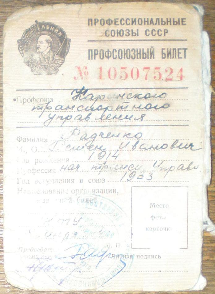 Профсоюзный билет начальника КТУ С. И. Радченко.