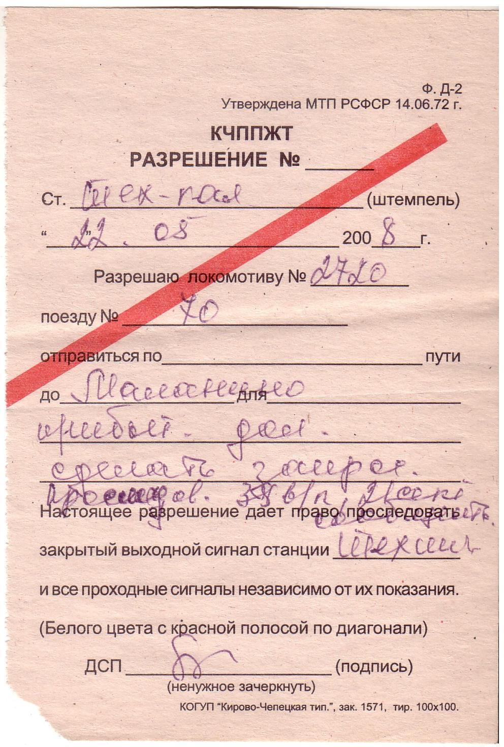 Предупреждение машинисту поезда, отправляющегося из Технической на Маланино. 22 мая 2008 года.