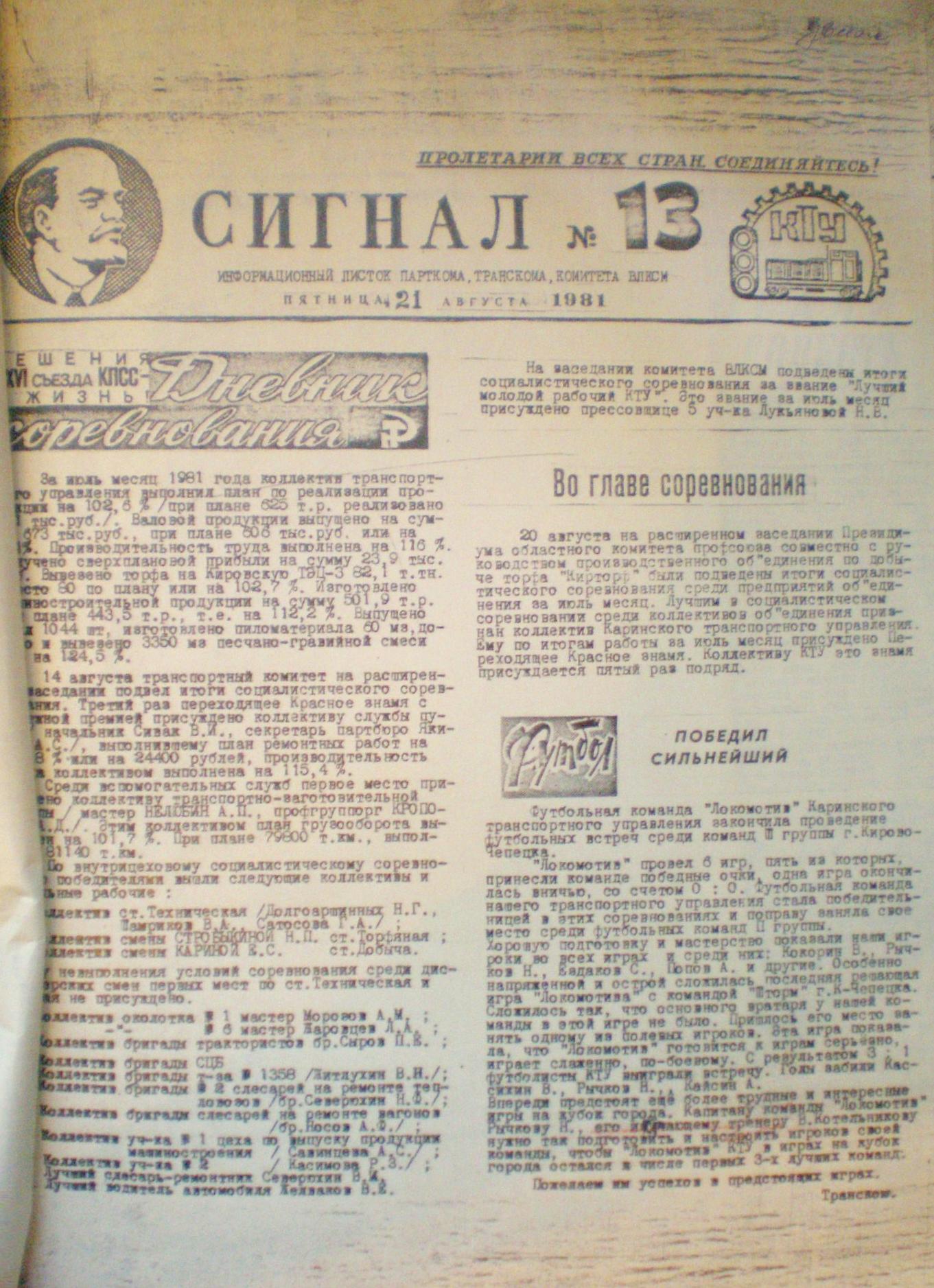 Газета Каринского транспортного управления «Сигнал», №13, 1981 год.
