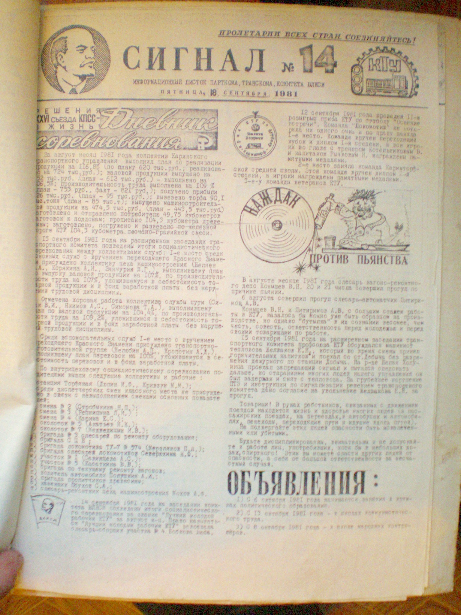 Газета Каринского транспортного управления «Сигнал», №14, 1981 год.