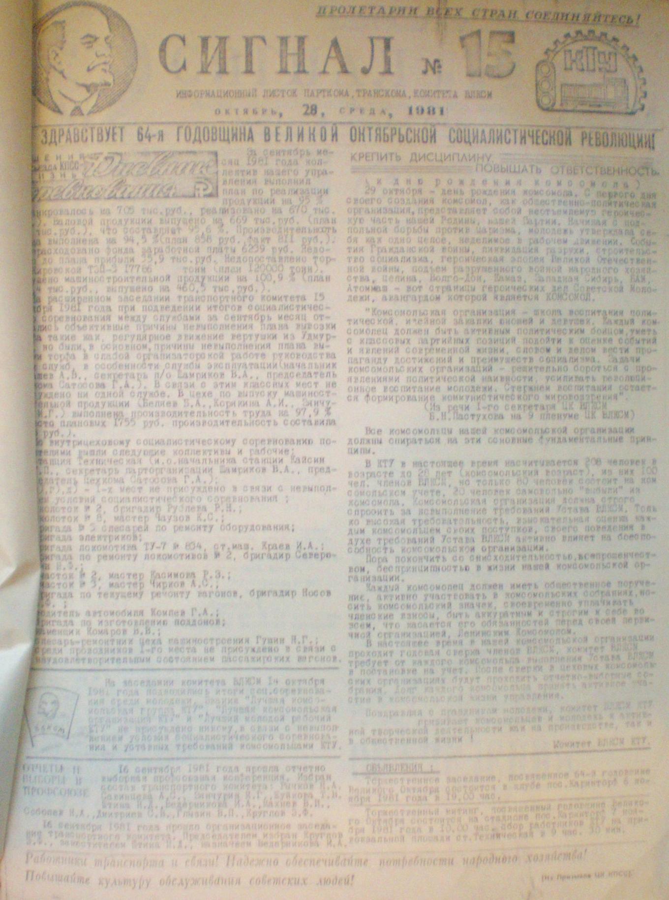 Газета Каринского транспортного управления «Сигнал», №15, 1981 год.
