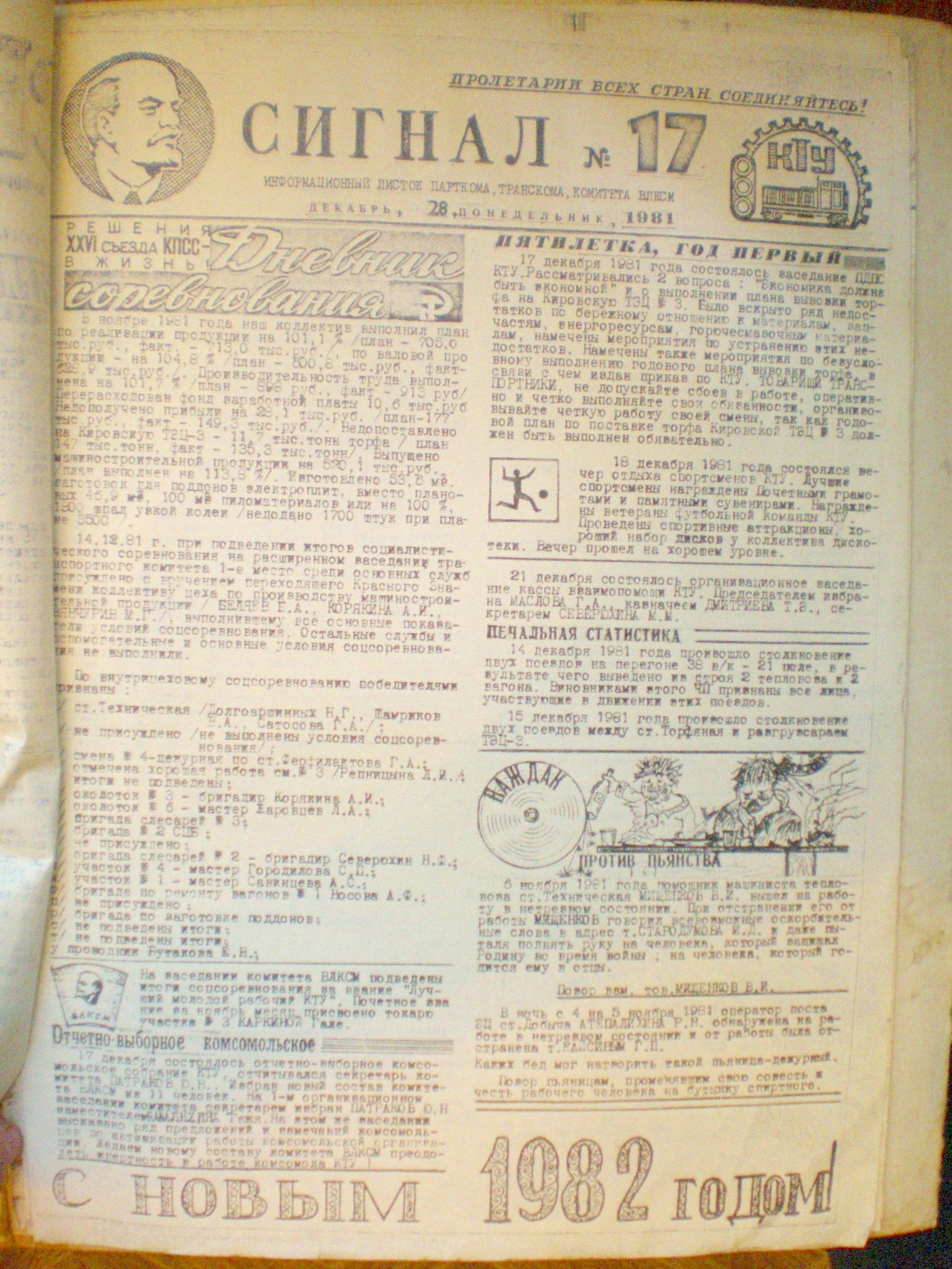 Газета Каринского транспортного управления «Сигнал», №1 (18), 1982 год.