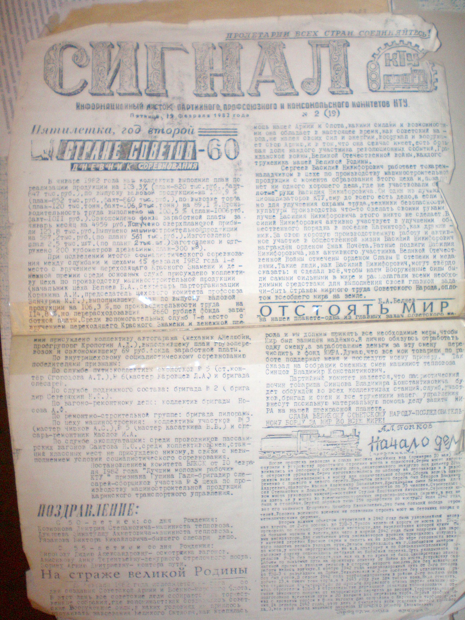 Газета Каринского транспортного управления «Сигнал», №2 (19), 1982 год.
