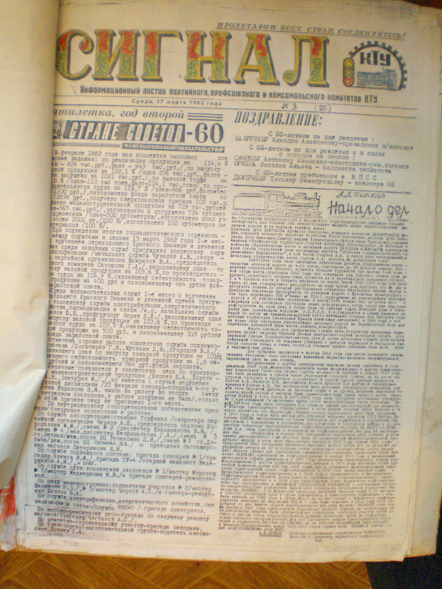 Газета Каринского транспортного управления «Сигнал», №3 (20), 1982 год.
