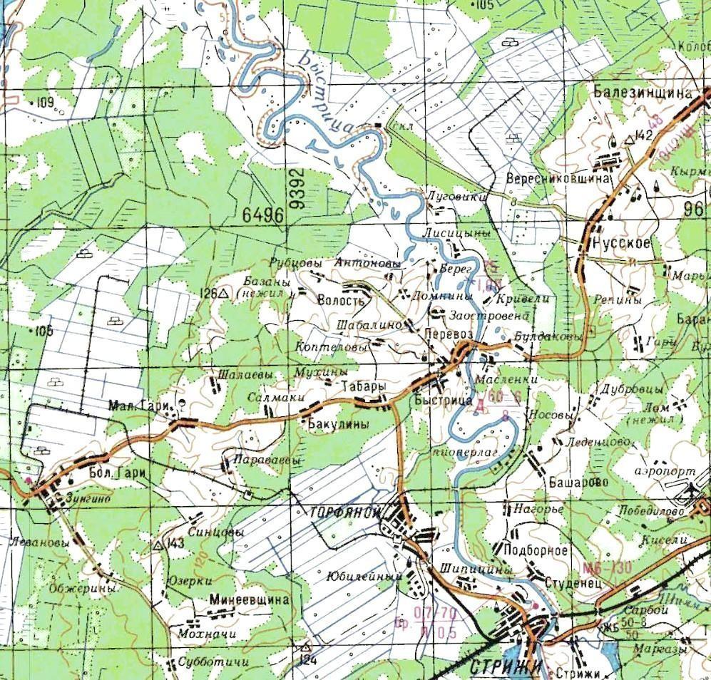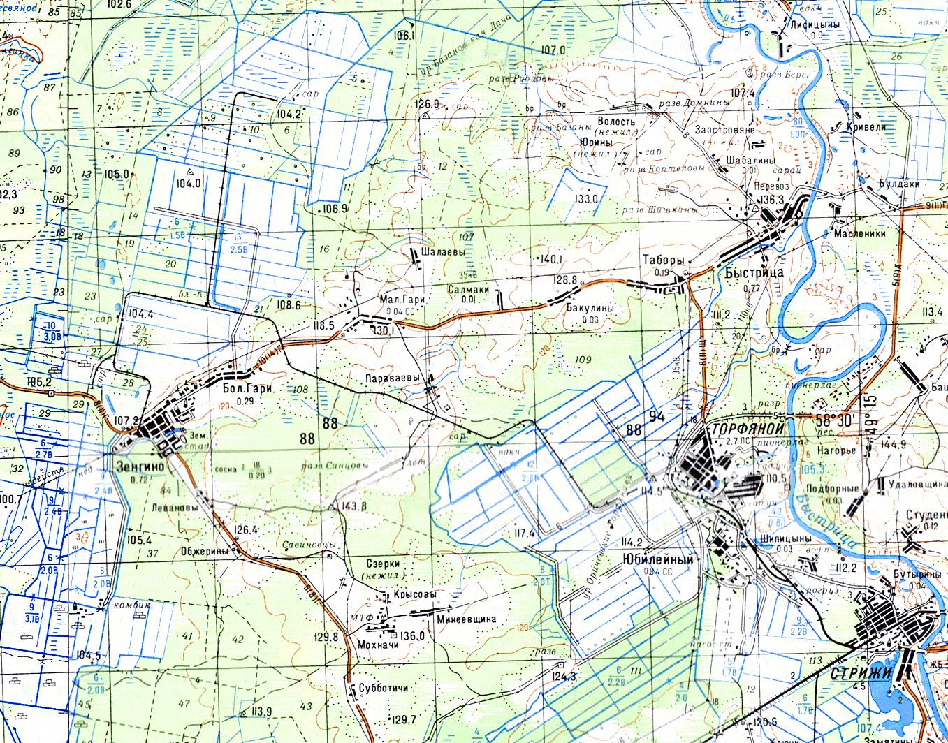 Узкоколейная железная дорога на топографической карте масштаба 1:100 000, изданной в 1994 году.