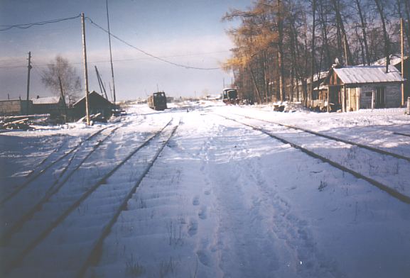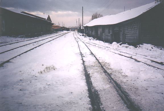 слева — узкоколейная железная дорога и здание диспетчерской Соловьёвской