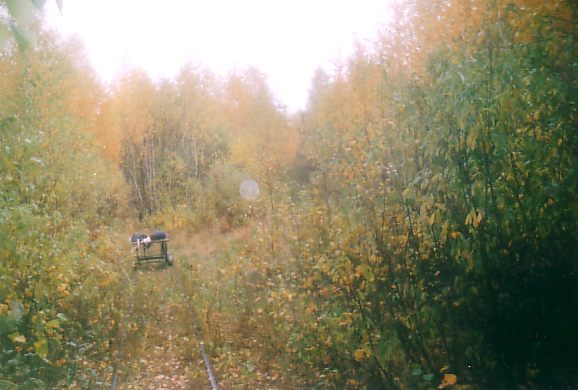 Тупик Гаранинской линии на 49 километре. Дрезина (тележка), на которой перемещался автор.