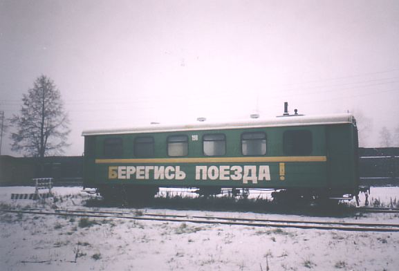 Один из пассажирских вагонов. Надпись «БЕРЕГИСЬ ПОЕЗДА» присутствует лишь с одной стороны.