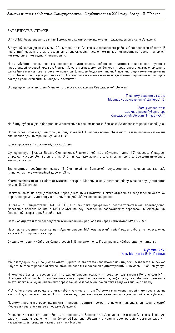 Заметка о положении в посёлке Зенковка (газета «Местное Самоуправление», 2001 год).