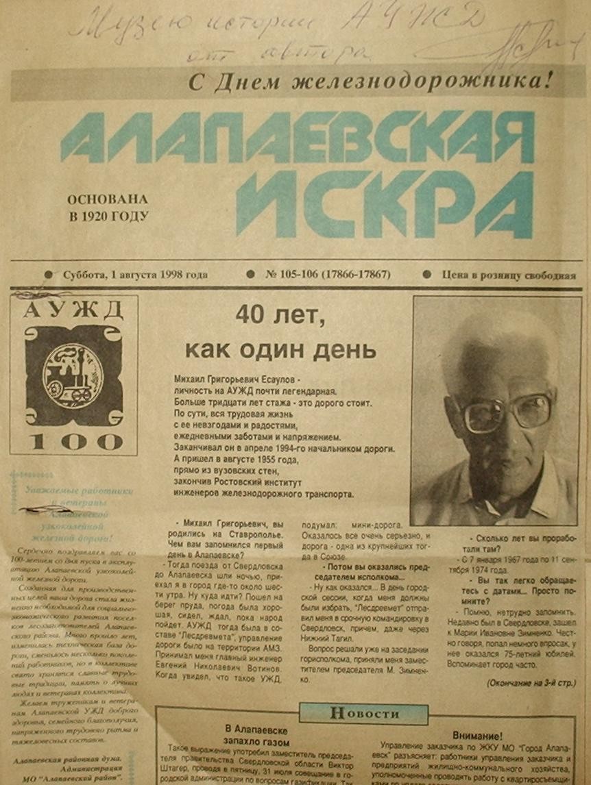 «40 лет, как один день» («Алапаевская Искра», 01.08.1998)