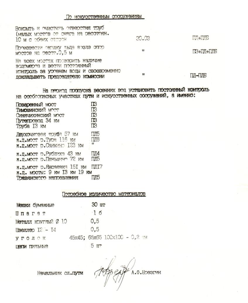 План мероприятий по пропуску весенних вод и ледохода на 2002 год. Подписан начальником службы пути Алапаевской узкоколейной железной дороги А.Ф. Брезгиным, утверждён начальником МУП «АУЖД» В. А. Канахиным.