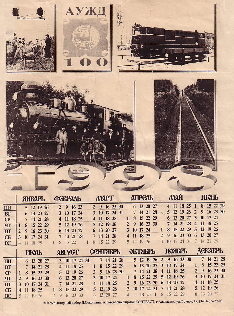Календарь был выпущен в 1998 году, к 100-летию Алапаевской узкоколейной железной дороги. На нём представлены исторические снимки, изображён памятник 90-летию дороги