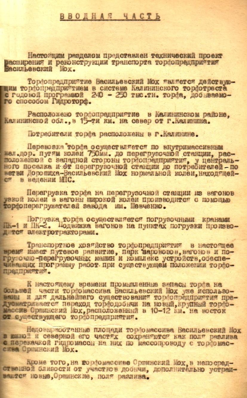 УЗКОКОЛЕЙНАЯ ЖЕЛЕЗНАЯ ДОРОГА ВАСИЛЬЕВСКОГО ПРЕДПРИЯТИЯ ПРОМЫШЛЕННОГО ЖЕЛЕЗНОДОРОЖНОГО ТРАНСПОРТА «ТЕХНИЧЕСКИЙ ПРОЕКТ» 1947 ГОДА (ЧАСТЬ 1)