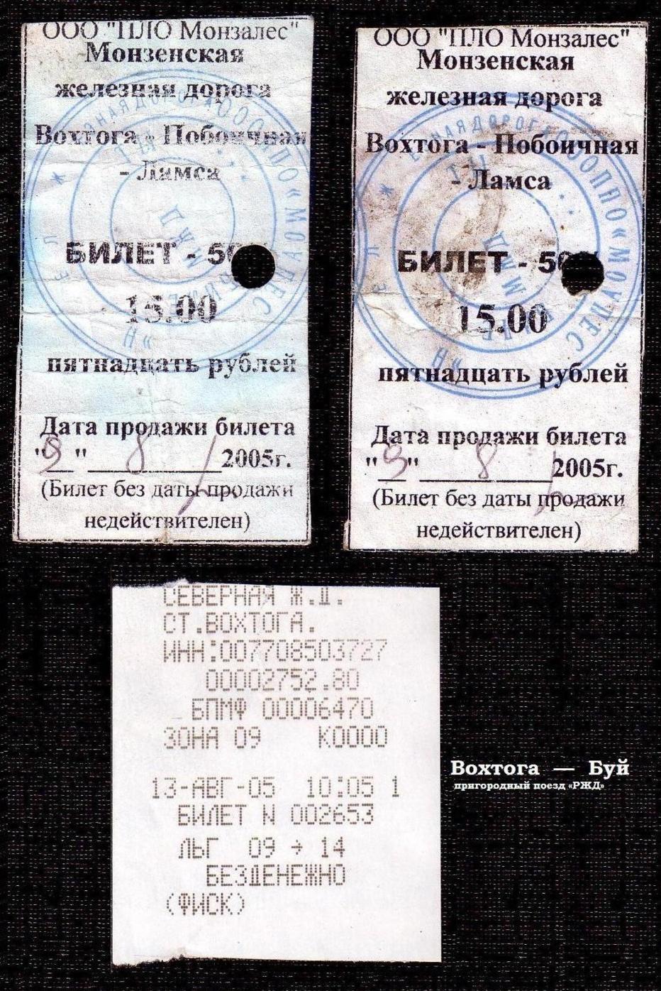 Билеты, проданные в пассажирском поезде сообщением Вохтога — Ида — Вохтога 12 августа 2005 года, а также билет на пригородный поезд от Вохтоги до Буя.