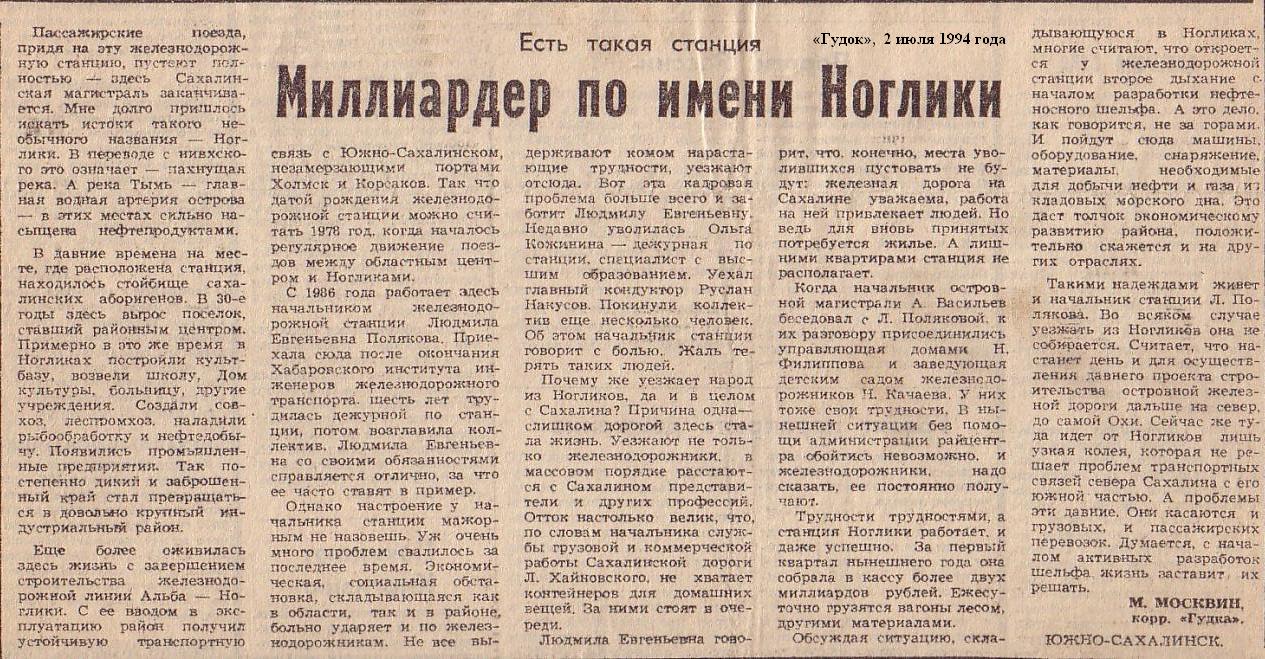 «Миллиардер по имени Ноглики» (газета «Гудок», 02.07.1994).