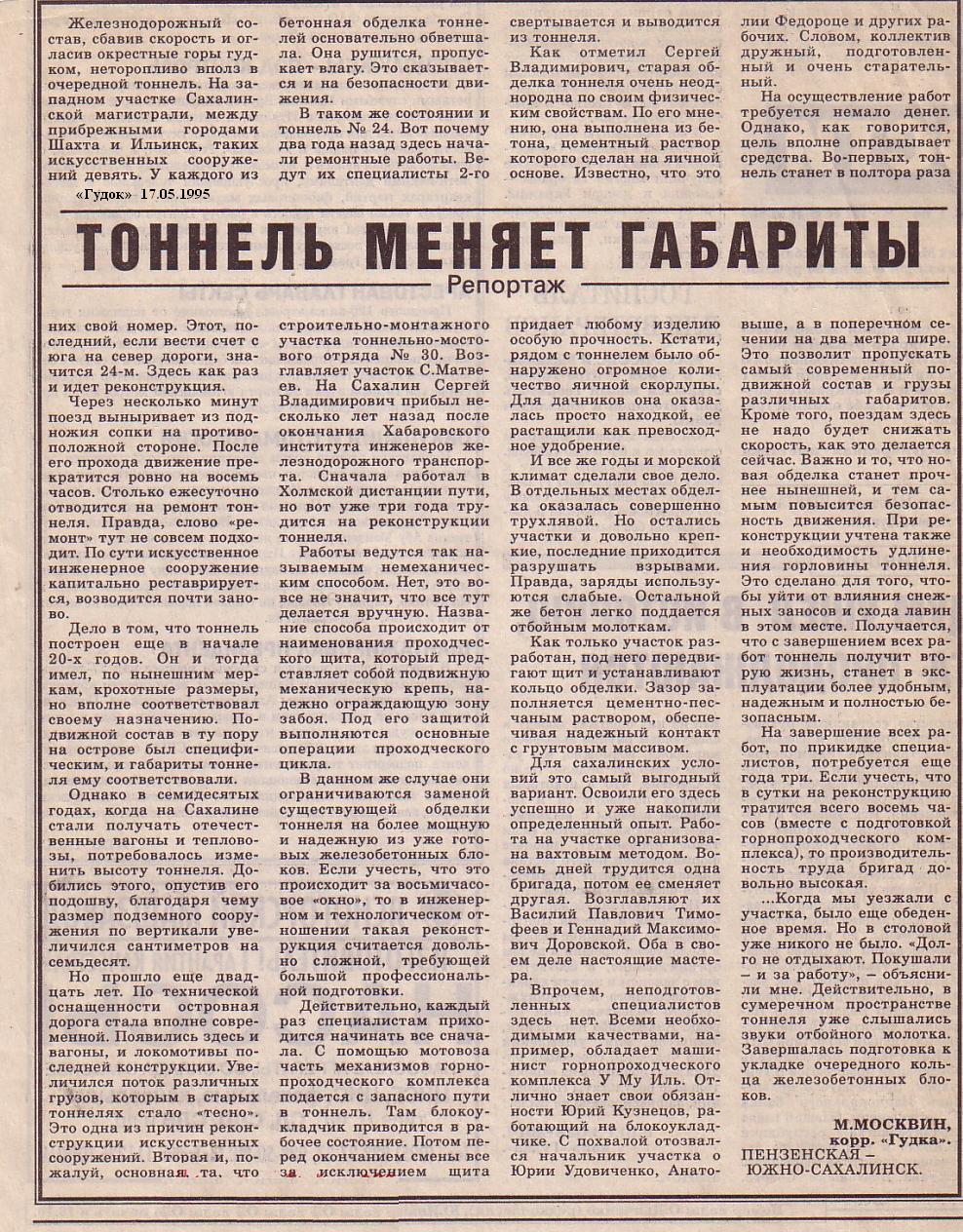 «Тоннель меняет габариты» (газета «Гудок», 17.05.1995).