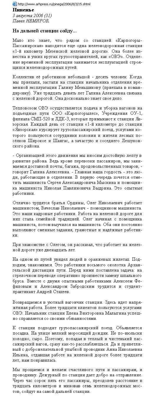 МЕЗЕНСКАЯ ЖЕЛЕЗНАЯ ДОРОГА МАТЕРИАЛЫ СРЕДСТВ МАССОВОЙ ИНФОРМАЦИИ