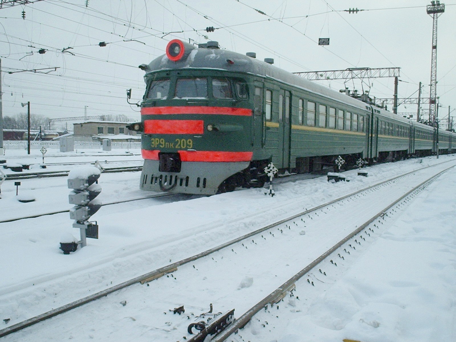 Электропоезд ЭР9пк-209, приписанный к депо Смоленск, на путях станции Вязьма, к северу от вокзала. Вид в сторону вокзала.