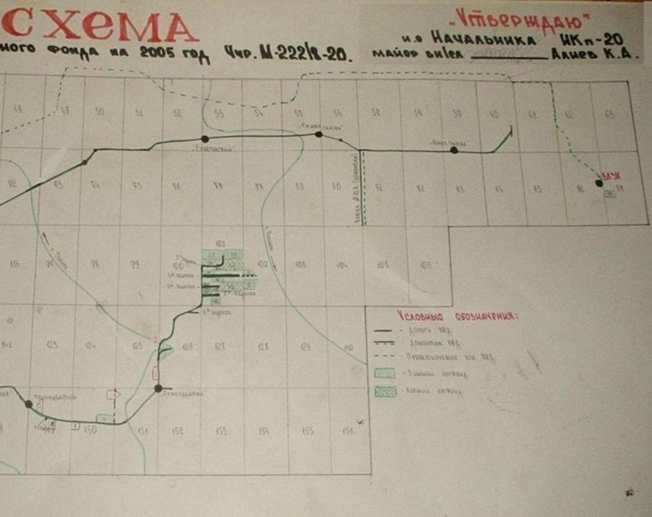 «Схема транспортного освоения лесосечного фонда на 2005 год». Подпись к обозначению «проектируемые пути УЖД»