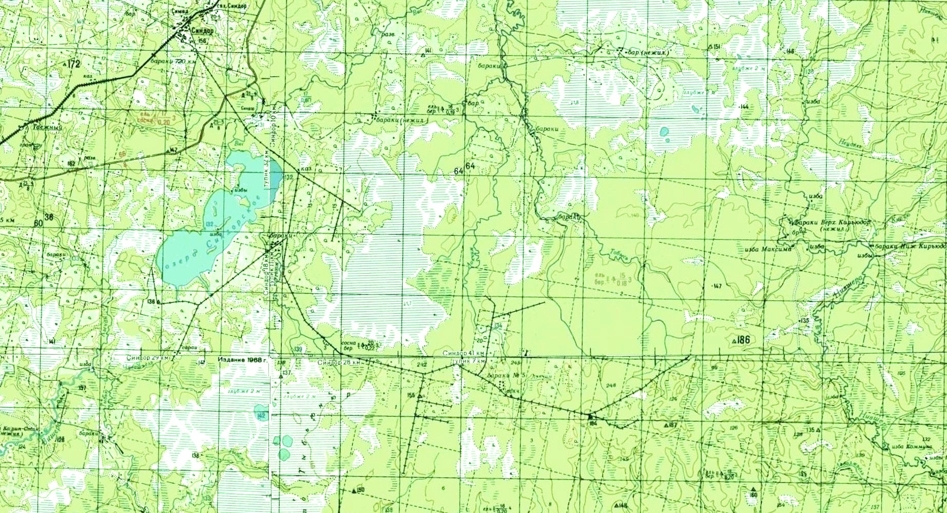 Узкоколейная железная дорога на топографической карте масштаба 1:500 000 (cостояние местности на 1960-е годы).