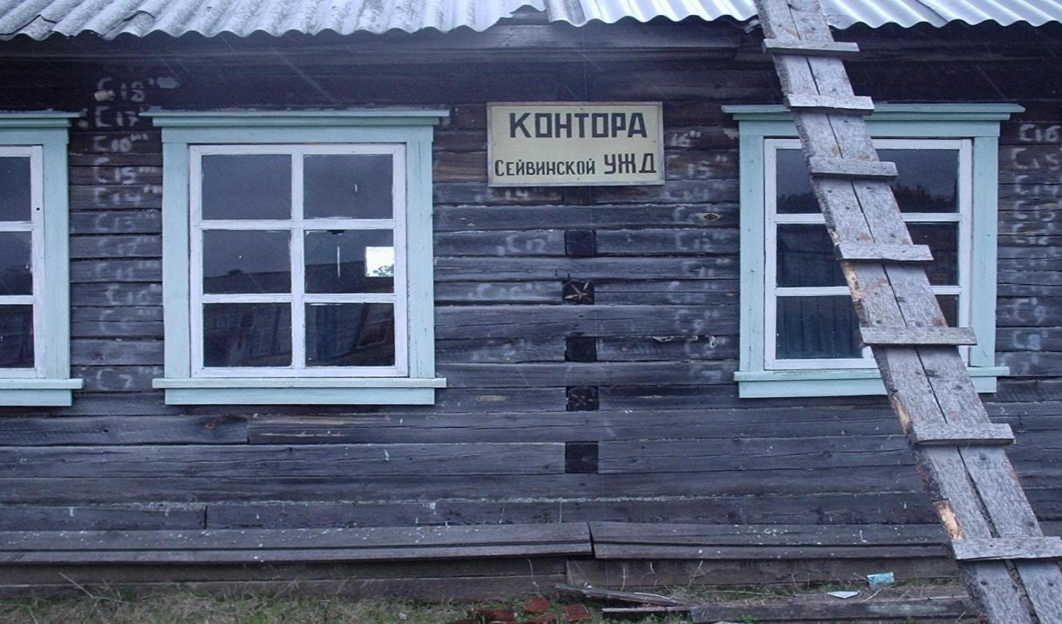 Сохранившаяся табличка с надписью «КОНТОРА Сёйвинской УЖД» на здании бывшей диспетчерской узкоколейной железной дороги.