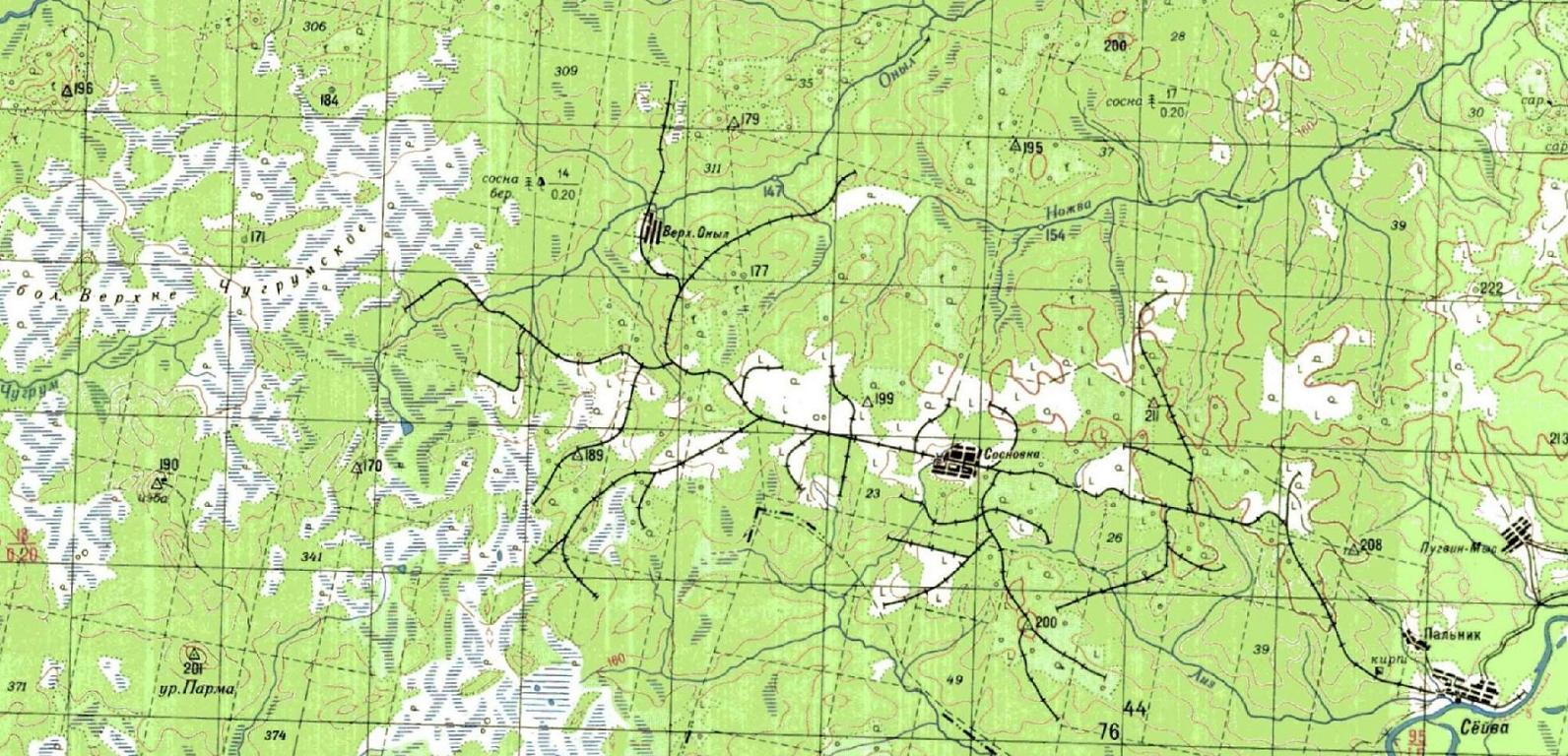 Узкоколейная железная дорога на топографической карте масштаба 1:200 000 (состояние местности на 1960-е годы).