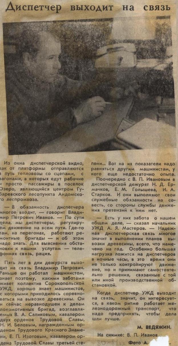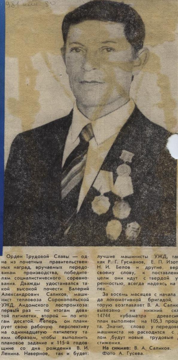 Материал в районной газете, посвящённый машинисту В. А. Саликову
