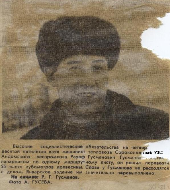 Материал в районной газете, посвящённый машинисту Р. Г. Гусманову.