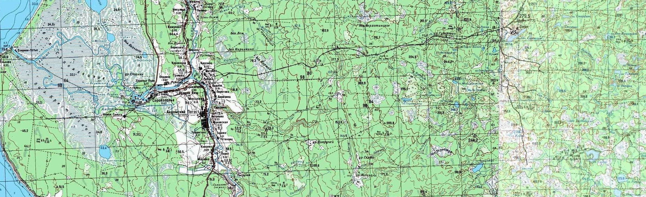 Узкоколейная железная дорога на топографической карте масштаба 1: 100 000, изданной в 1992 году (основная часть), 19?? году (восточная часть).