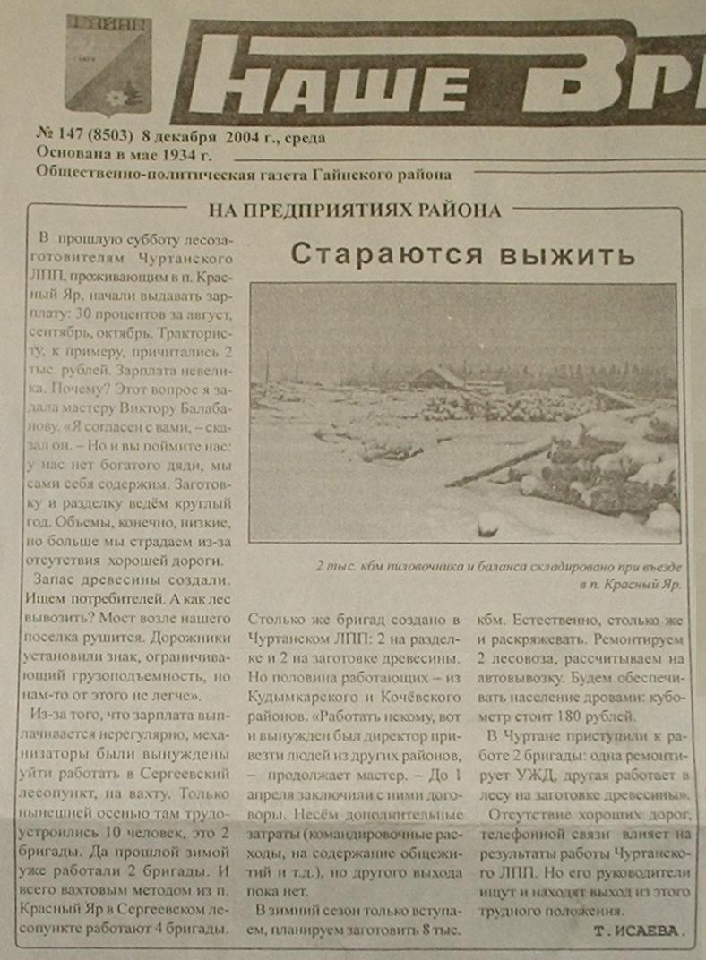 «Стараются выжить» (материал из гайнской районной газеты «Наше Время», 8 декабря 2004 года).