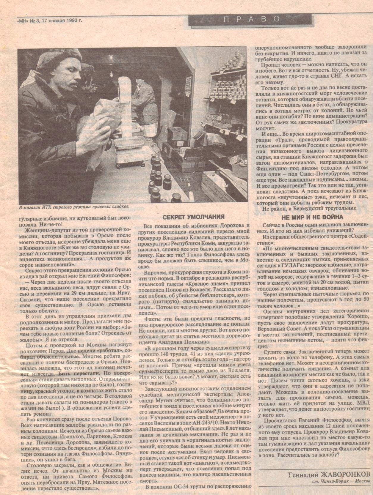 «Исчезнувший ад» (публикация, посвящённая колониям в районе посёлка Ветью, газета «Московские Новости», 17 января 1993 года).