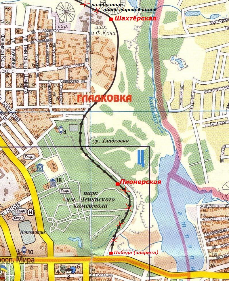 Узкоколейная железная дорога на плане города Донецка, изданном в 200? году.