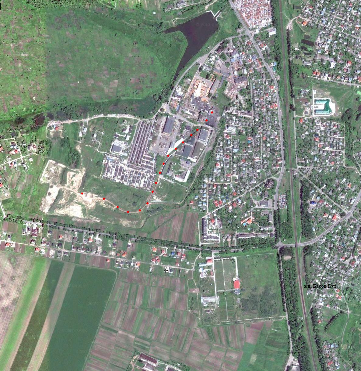 Узкоколейная железная дорога на спутниковом снимке (источник — «Google Maps», дата съёмки — 2010 год).