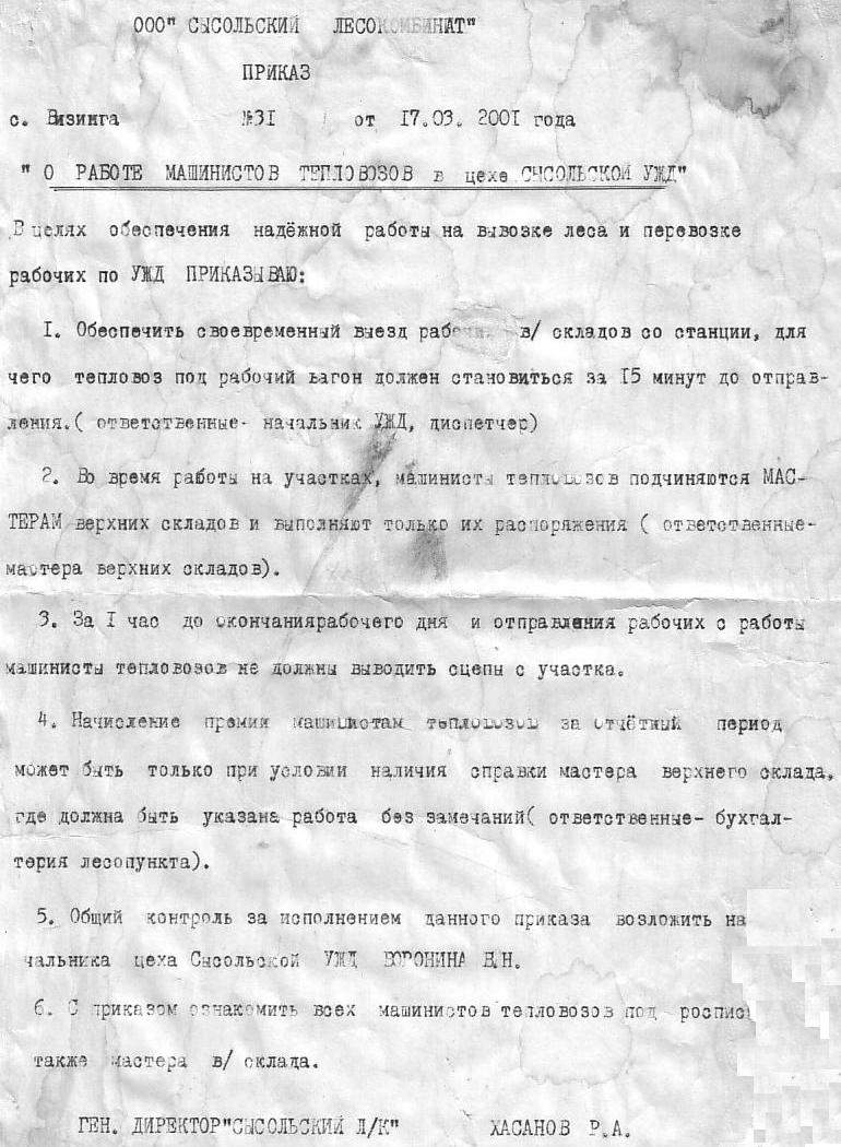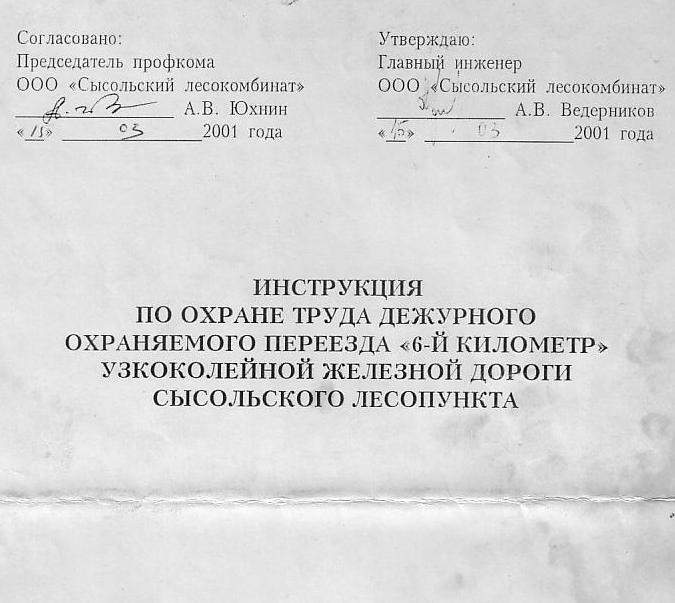 Приказ от 17 марта 2001 года «О работе машинистов в цехе Сысольской УЖД».