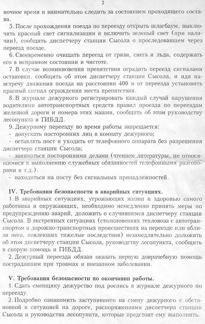 Должностная инструкция дежурного по охраняемому переезду «6 км», утверждённая в 1999 году —