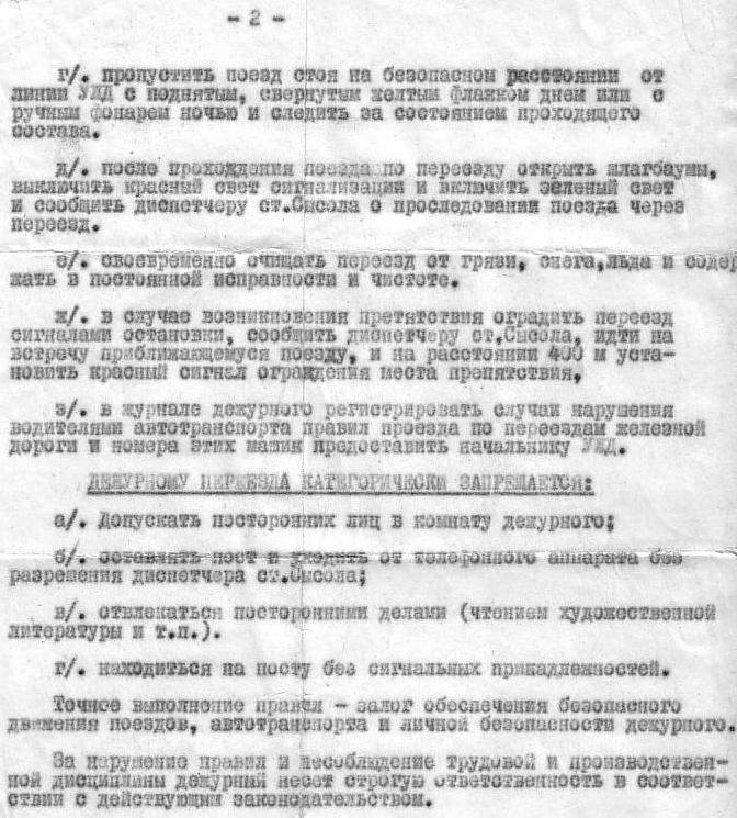 Должностная инструкция дежурного по охраняемому переезду «6 км», утверждённая в 1972 году —