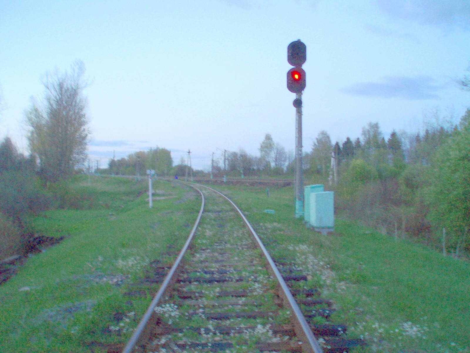 Вид из той же точки в противоположном направлении. Впереди — входной светофор станции Дурово.