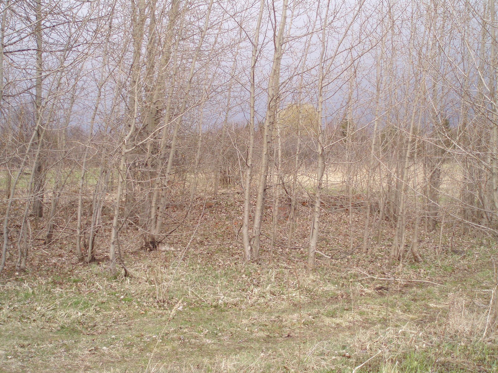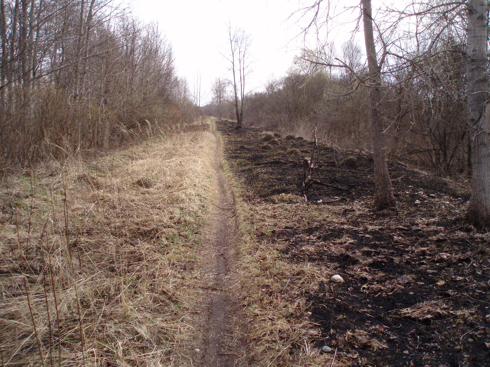 Разобранная линия узкоколейной железной дороги у переезда на южной окраине посёлка Октябрьский.