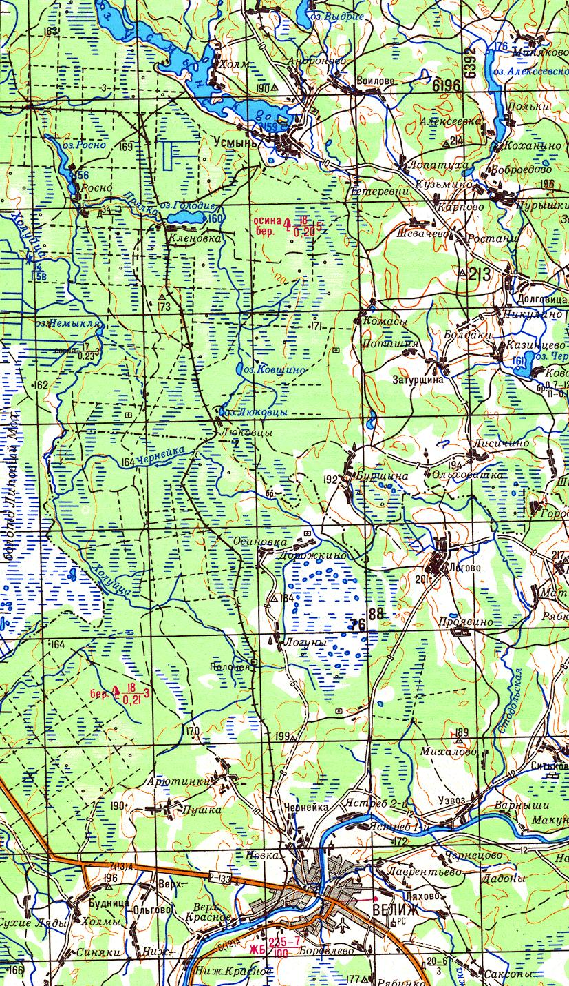 Узкоколейная железная дорога на топографической карте масштаба 1:200 000, изданной в 198? году.
