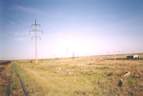 Магистральный путь, вид в сторону Шантобе. Справа — территория перегрузочной станции.