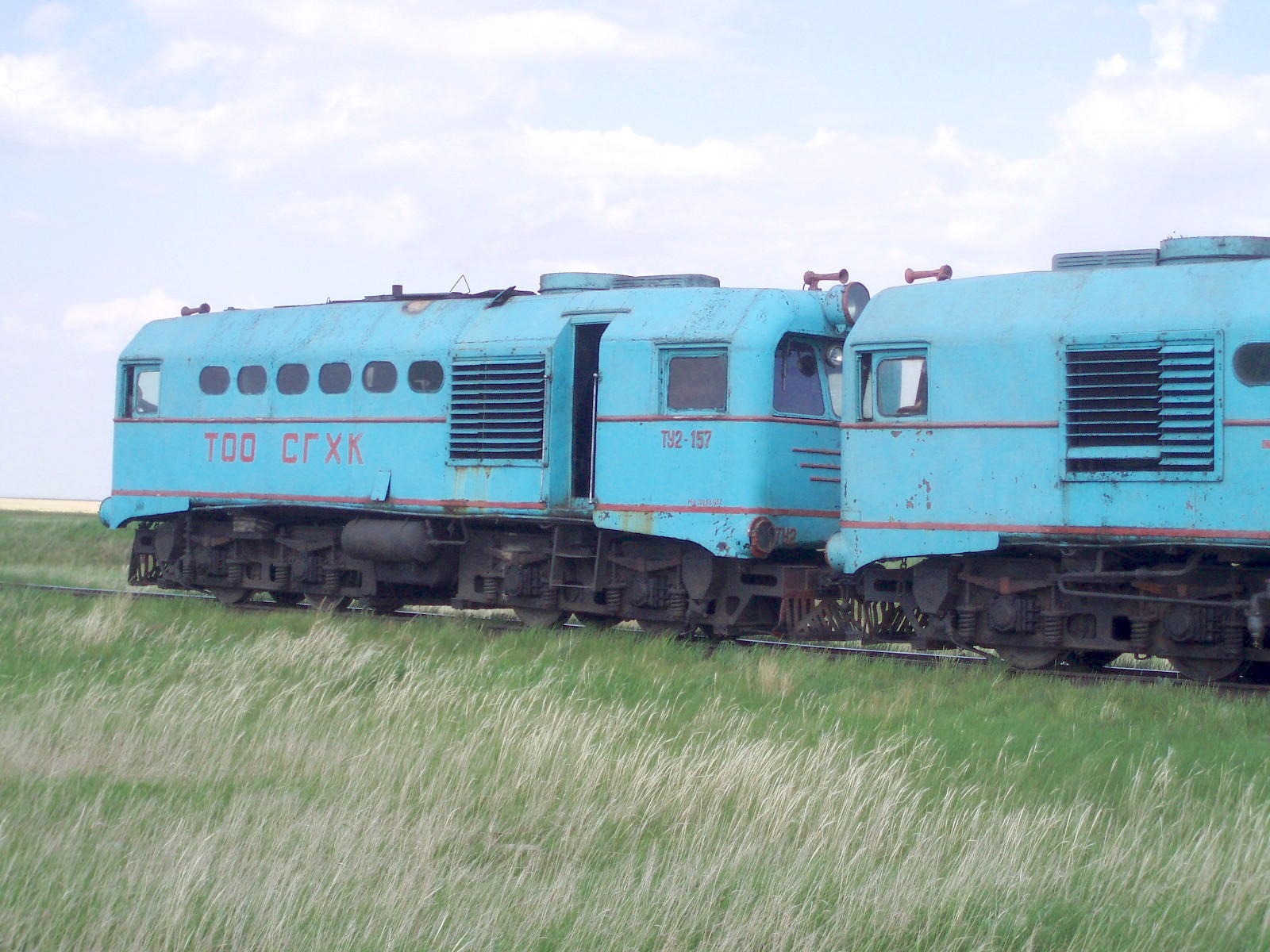 Сплотка тепловозов ТУ2-157 и ТУ2-115 ведёт грузовой состав в направлении станции Балапан.