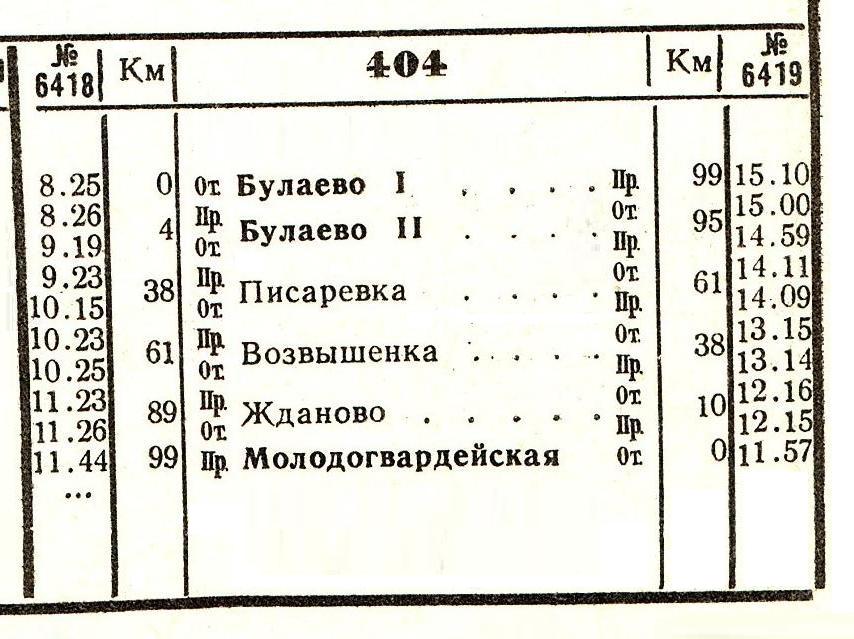 Расписание движения пригородного поезда сообщением Булаево I — Молодогвардейская на 1981–1982 гг.