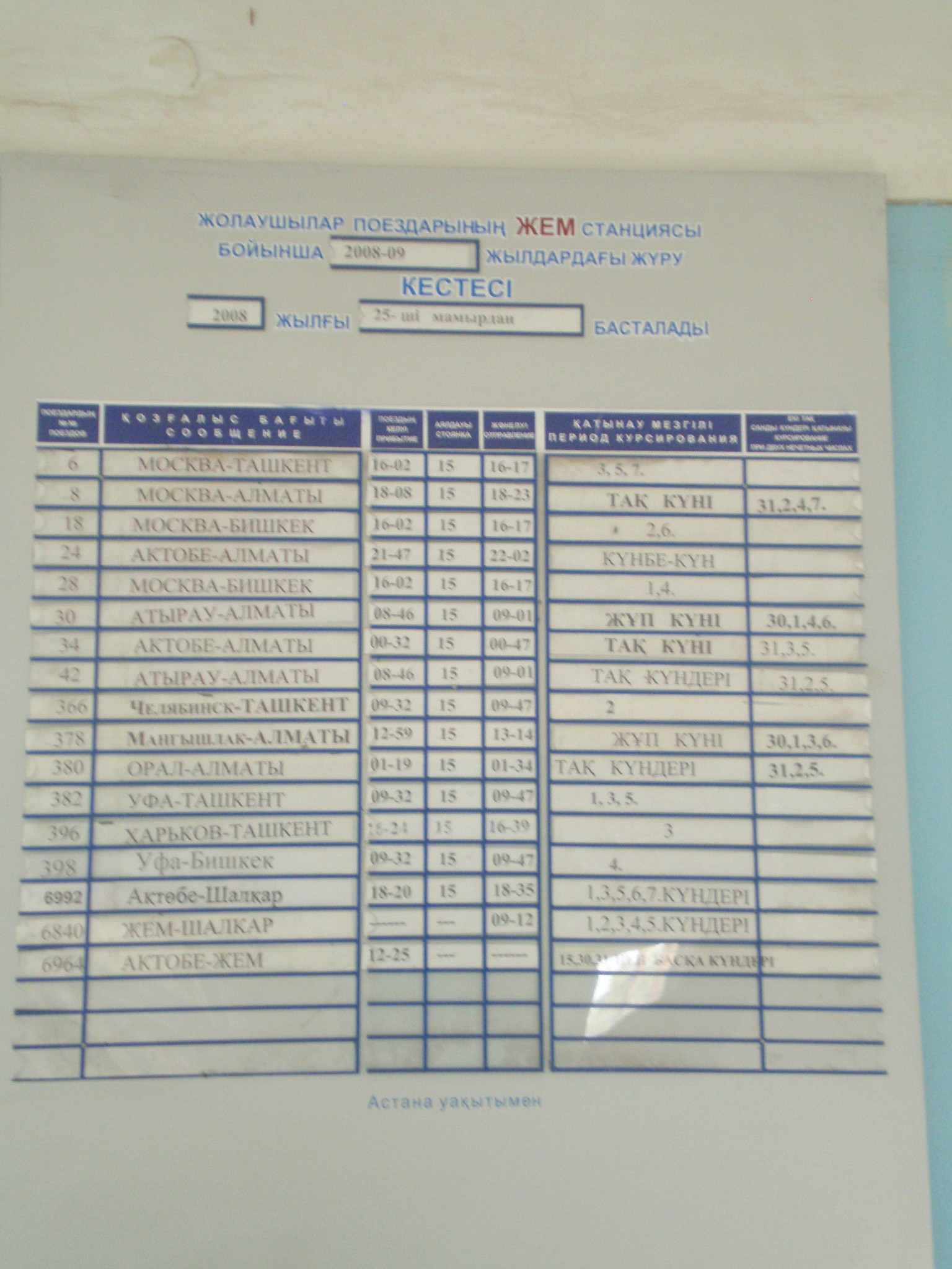 Расписание движения поездов, вывешенное на вокзале станции Эмба (Жем).